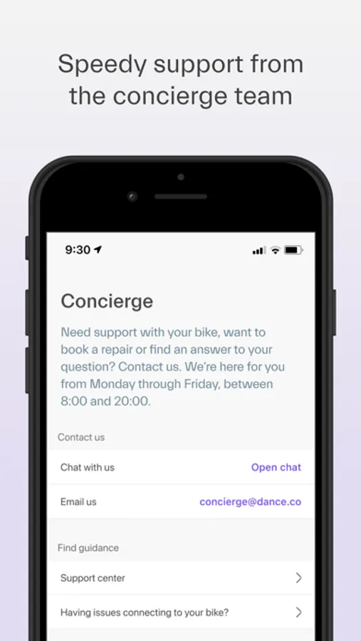 Download the Dance app to connect to your bike, track your rides, request on-demand repairs, or contact the Dance concierge team. The app even shows you how much CO2 you save on each trip compared to a car journey.