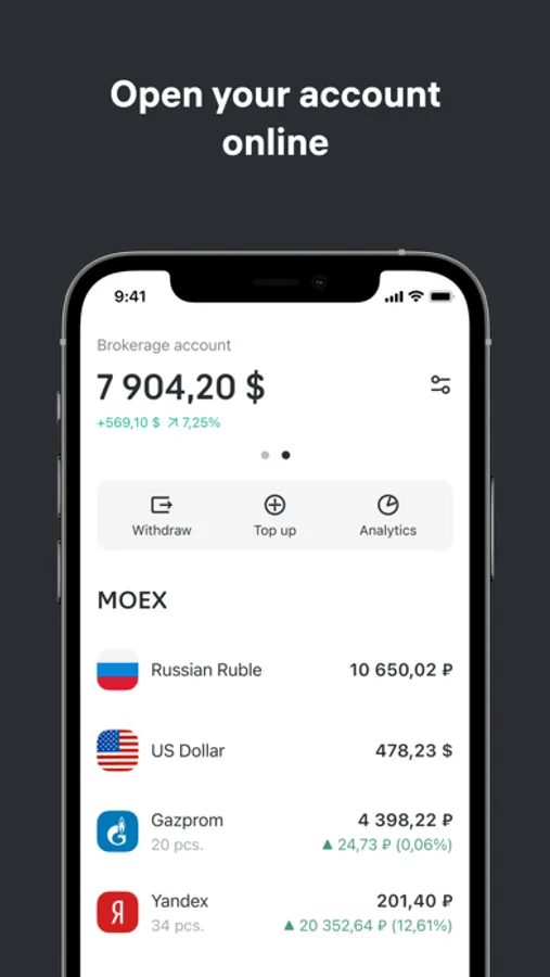 This user-friendly mobile app is a convenient way to invest in stocks, bonds, funds, and currencies from your mobile phone. It provides online access to the stock market and thousands of securities, and moreover, access to 10 000 professional instruments for qualified investors.