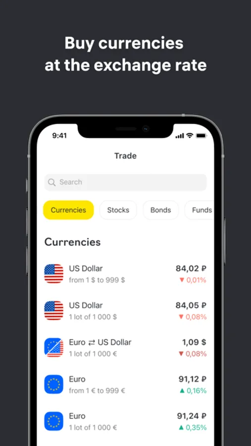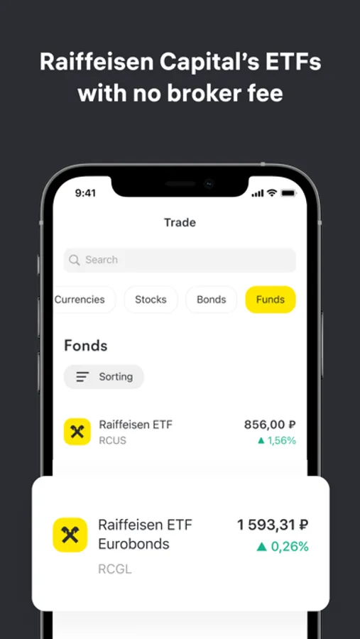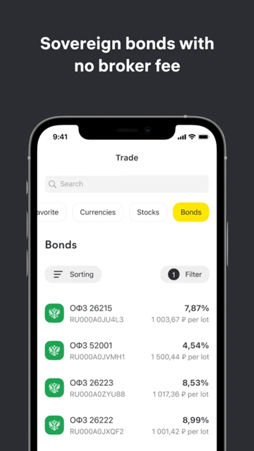 ‣ Stocks, corporate and government bonds (OFZ), eurobonds, and exchange-traded funds (ETF) with no broker fee.