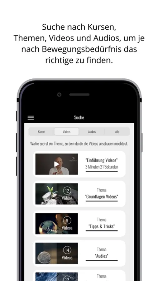 Du kannst aber auch einzelne Videos und Themen erkunden, oder dich von Audio-Dateien inspirieren lassen.