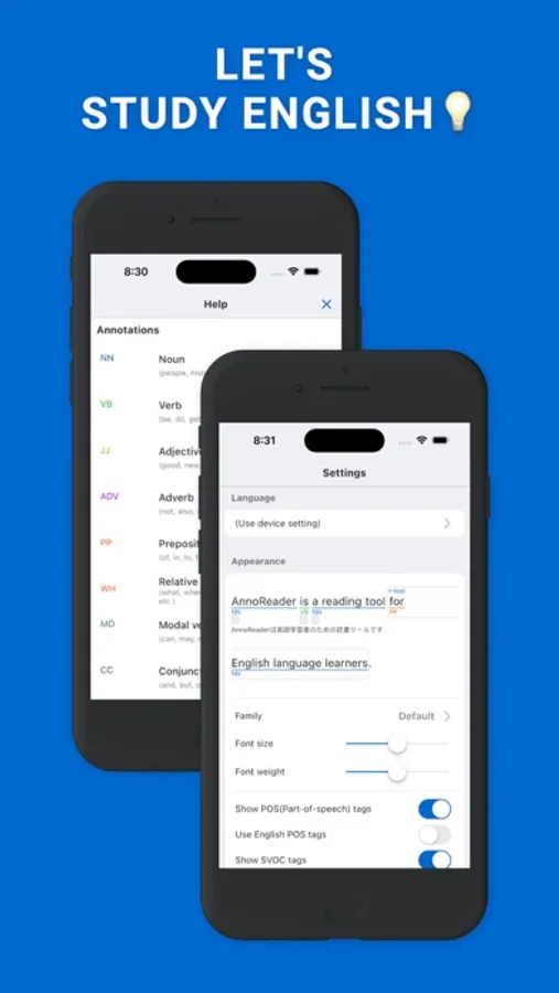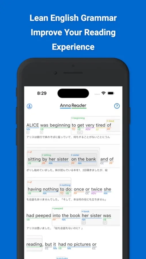 This tool visualizes English sentence structure, such as nouns, verbs, clauses, and phrases, by adding various annotations to make a text more readable.