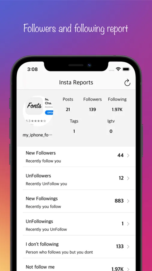 this app contains your follower count in app of instagram and gives you report based on you activity on Instagram.
