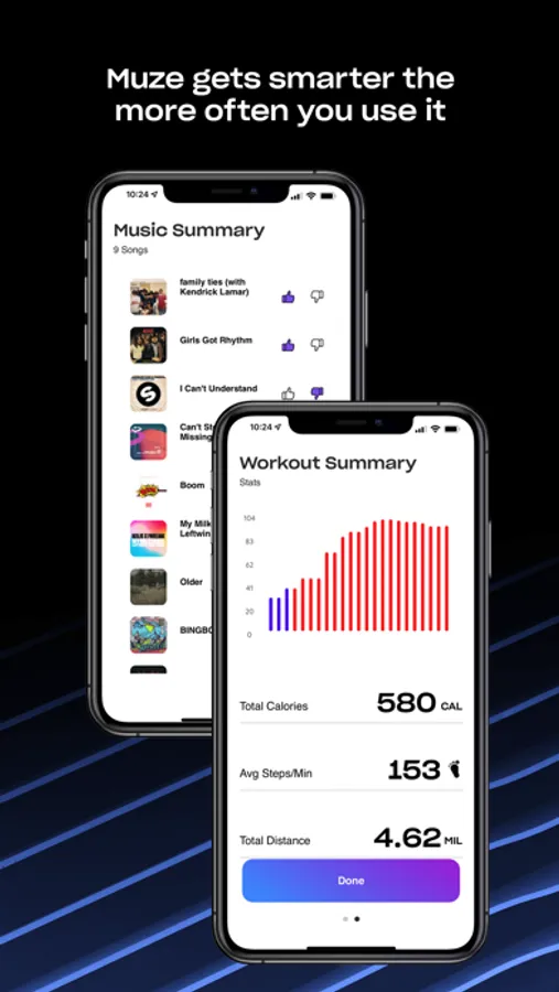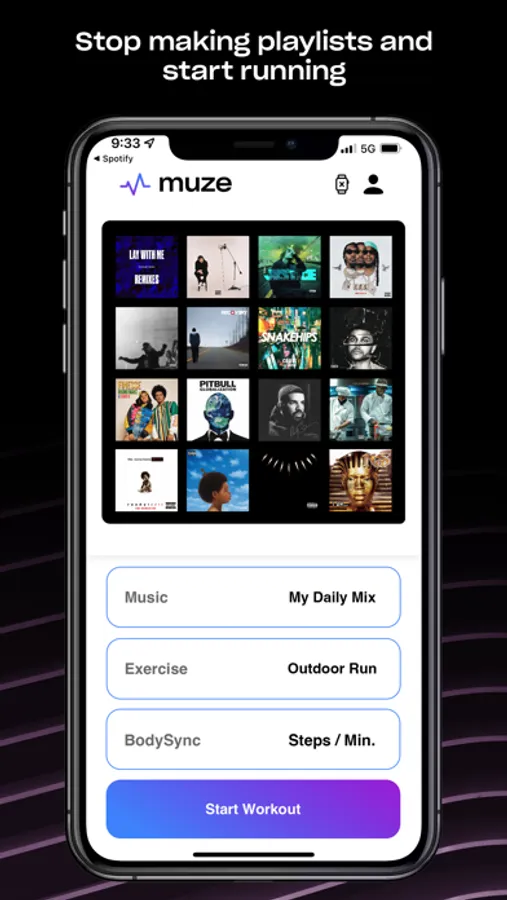 Teach Muze what you like by connecting it to your Spotify account. Our patent-pending algorithm analyzes the lyrics and music of 70 million songs to identify the anthems that will move you from any genre. As you use it, machine learning ensures each new soundtrack is better than the last.
