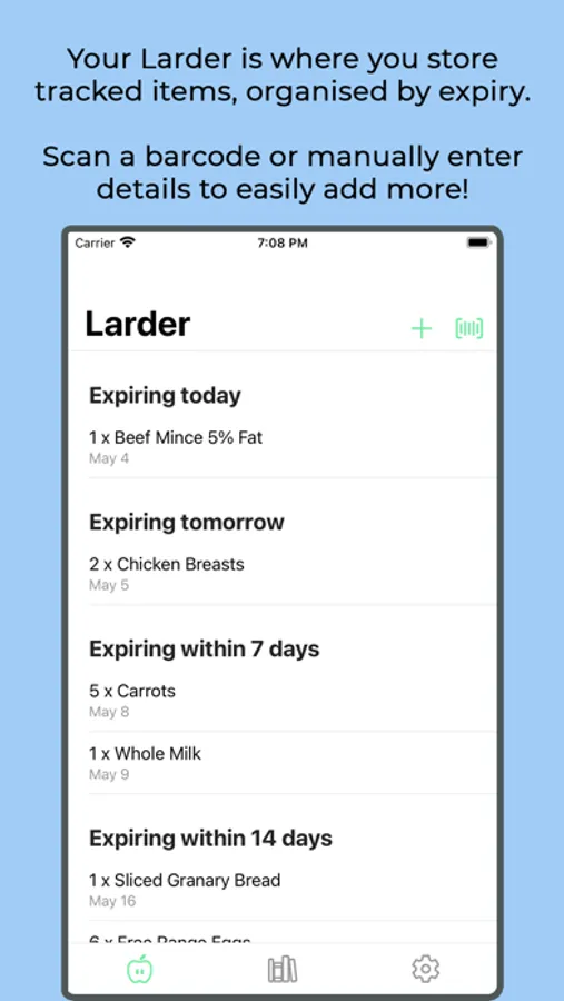 Larder can remind you daily and weekly when items are expiring, and will show them in a useful list. You're able to scan most products from around the world, and even enter custom items yourself if they don't have a barcode.