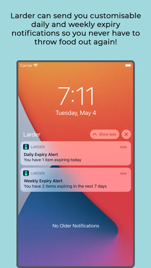 Are you tired of having to clear out your fridge and cupboards and throw away a bunch of expired and smelly food? Simply scan your groceries as you put them away using Larder and you'll never have to do this again!