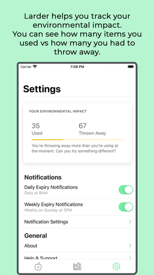 No annoying ads, no monthly subscriptions or personal details required! We don't believe you should have to pay monthly just to reduce your spend and environmental impact. The base features of Larder will always be free of ads, subscriptions and monthly charges - and we won't gather or sell your personal data either.