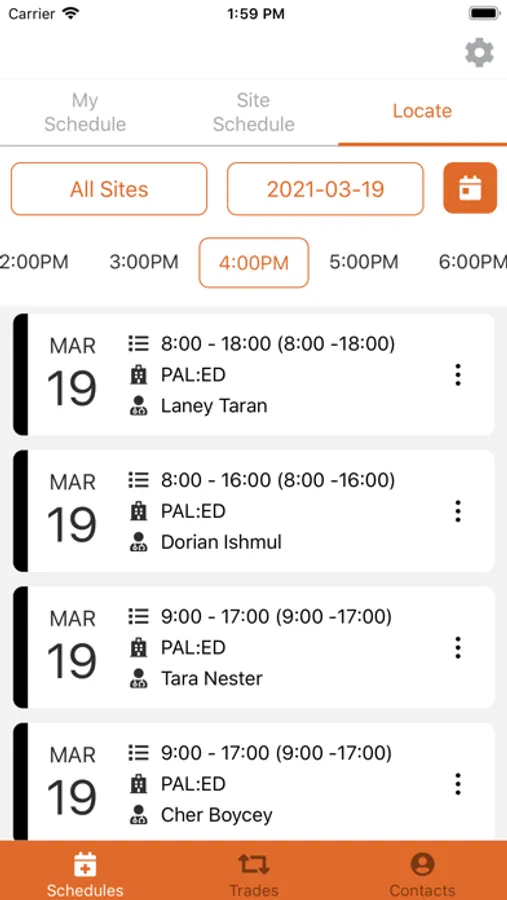 ∙ Locate View: View all shifts, across all sites, for a specific time. (Ex, see everybody who is working right now, across all schedules you have access to)