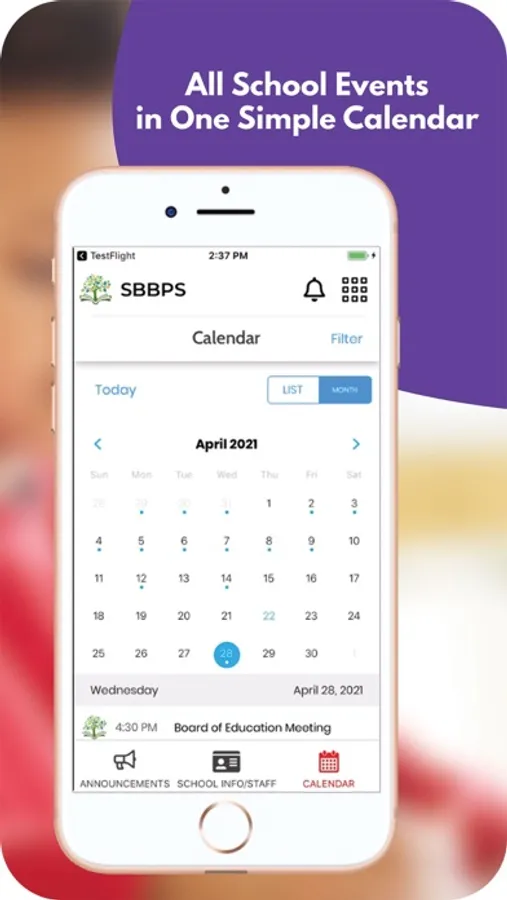 The app includes information for the district and all schools. Filter by the school your child attends to feature information for that school.