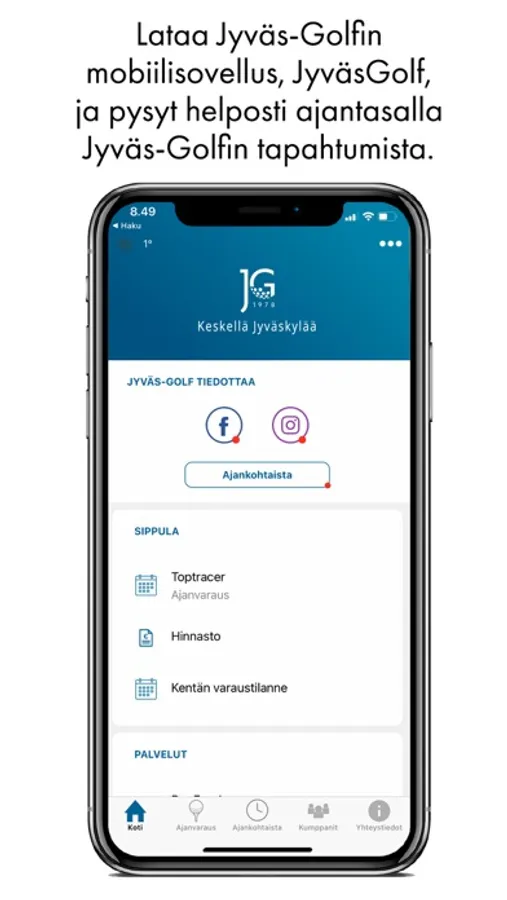 Sovelluksella voit varata lähtöaikoja ja seurata Jyväs-Golfin ja sen oheistoimijoiden tiedotteita.