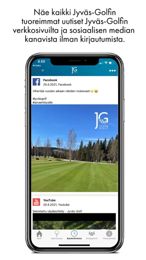 Sovelluksesta löydät kaikki uusimmat uutiset Jyväs-Golfin verkkosivuilta ja kaikista sosiaalisen median kanavista. Näitä kanavia pääset seuraamaan ilman sosiaalisen median tunnuksia ja kirjautumatta. Kaikista uutisista saat myös halutessasi push-ilmoituksia ja pysyt ajantasalla. Sovelluksesta löytyy myös kirjautumismahdollisuus NexGolf-ajanvaraukseen.