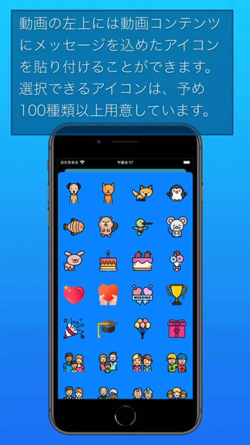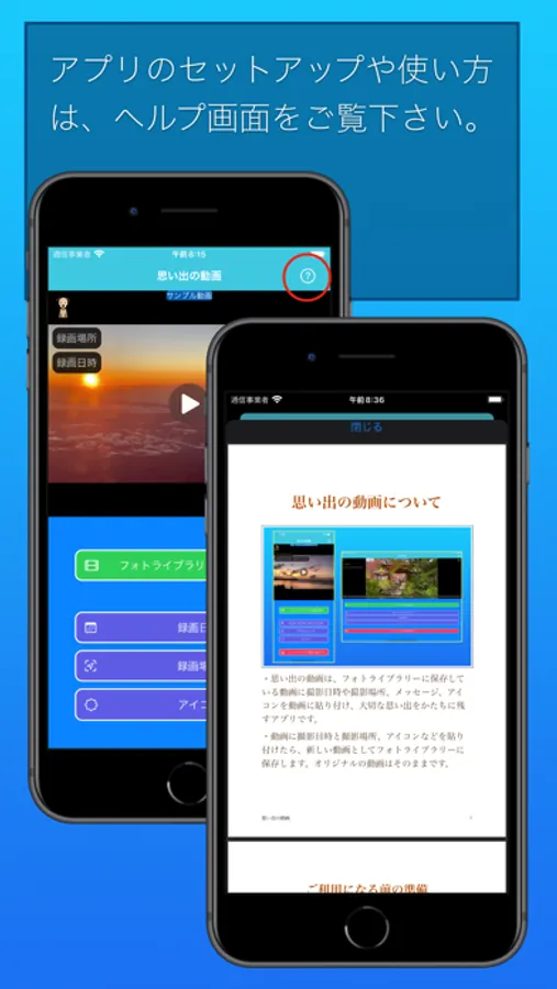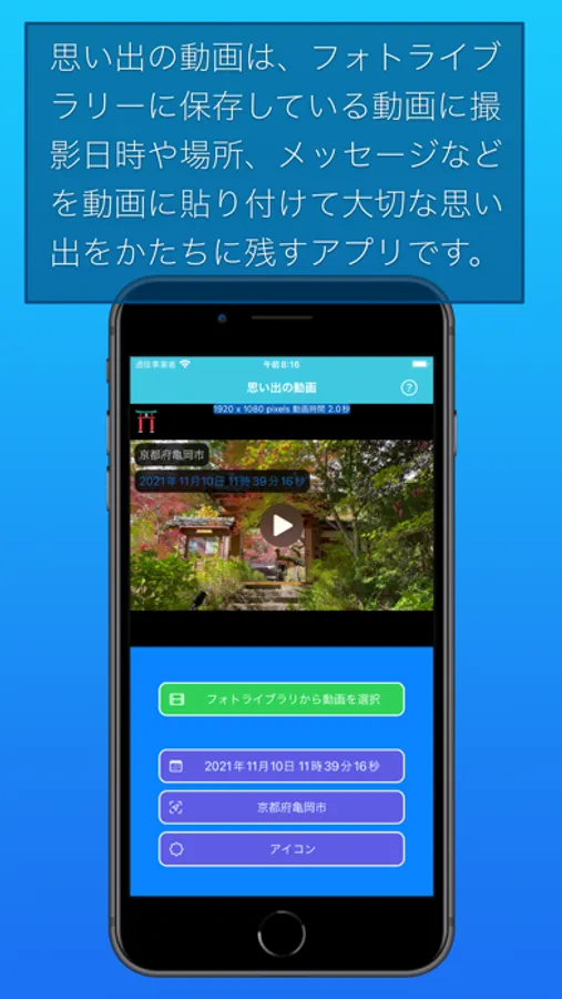 思い出の動画は、フォトライブラリーに保存している動画に撮影日時や撮影場所、メッセージ、アイコンを動画に貼り付けて大切な思い出をかたちに残すアプリです。