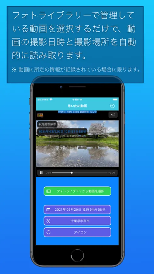 フォトライブラリーで管理している動画をアプリで選択すると、動画に記録されている撮影日時と撮影場所(位置情報の記録がされている動画に限る)を自動的に読み取ります。