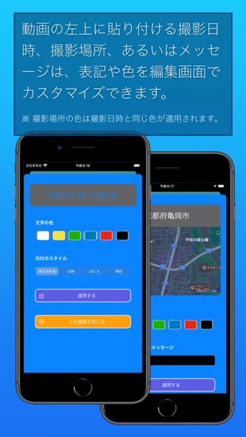 動画に貼り付ける撮影日時と撮影場所の文字をカスタマイズすることができます。