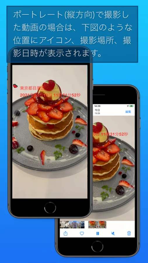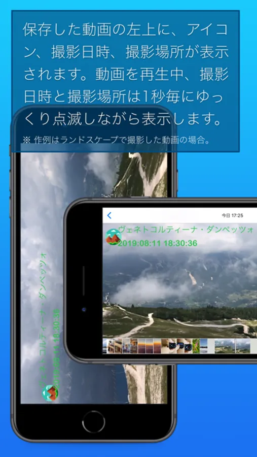 動画に撮影日時と撮影場所、アイコンなどを貼り付けたら、新しい動画としてフォトライブラリーに保存します。オリジナルの動画はそのままです。
