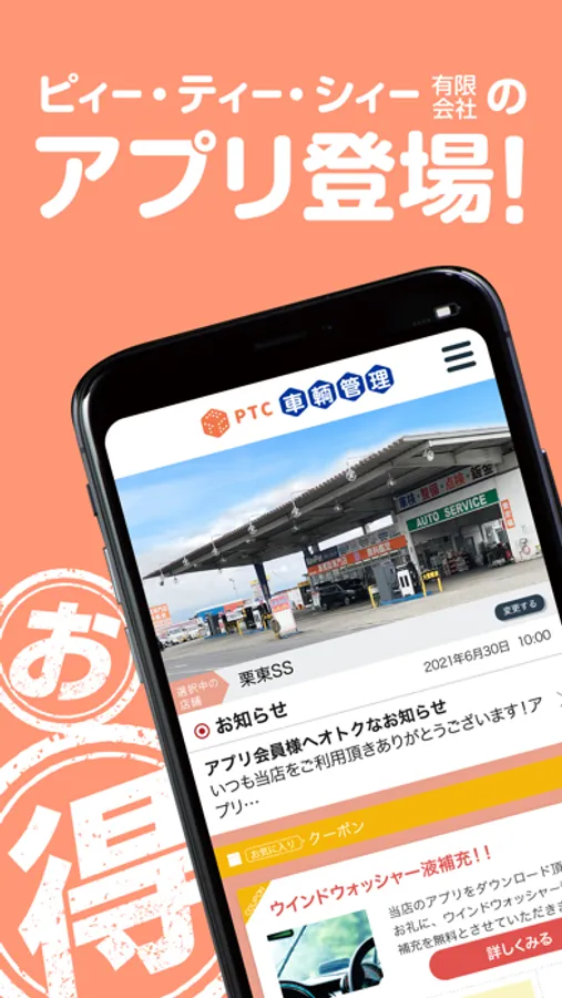 当社の公式アプリ「PTC車輌管理」ではアプリで簡単に洗車・コーティングなどのご予約や愛車のメンテナンス管理が可能の他、当店で利用いただけるお得なクーポンや各種メニューの割引情報を配信しております。