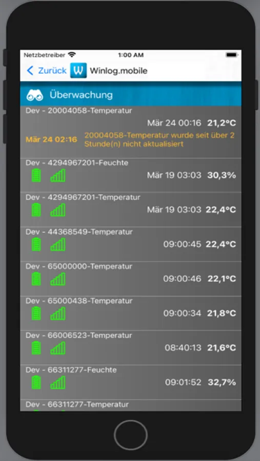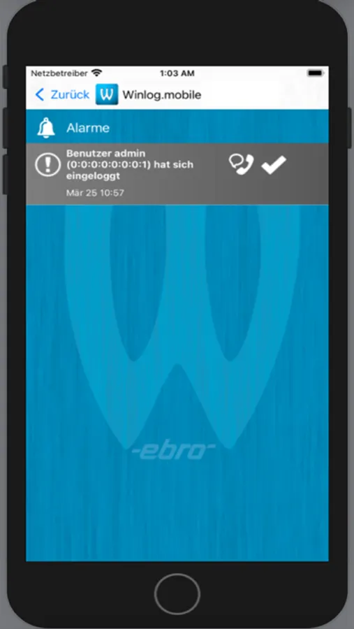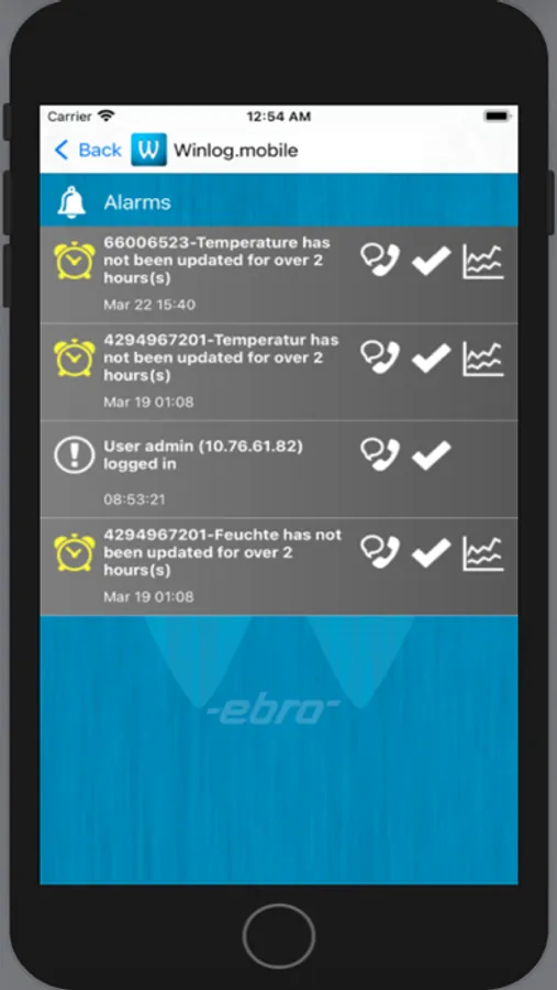 This app enables the user to access Winlog.web remotely via a mobile device. The current measurement values can be checked in watch lists. The app will show alarm messages where required and can indicate those with a ring tone and/or vibration alarm. It enables the user to forward those messages to the contacts stored on the mobile device.