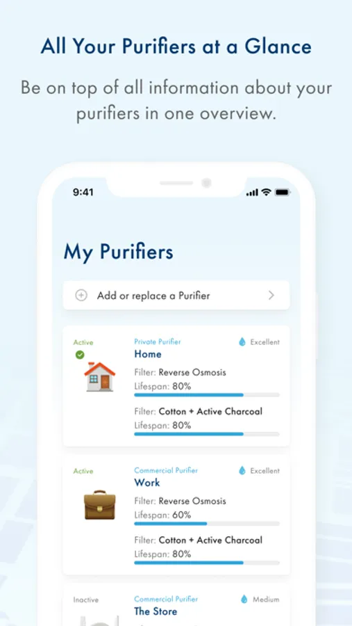 o Review both inflowing (tap water) and outflowing (purified water) water quality information, in real-time