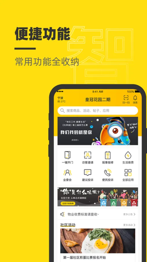 以报事报修、生活缴费、访客管理等基础物业服务为基础,提供社区商城等生活服务,同时更全面丰富了友邻社交,为业主营造更安全、更便捷、更具幸福感的一体化智慧社区生活