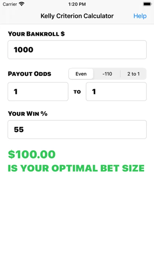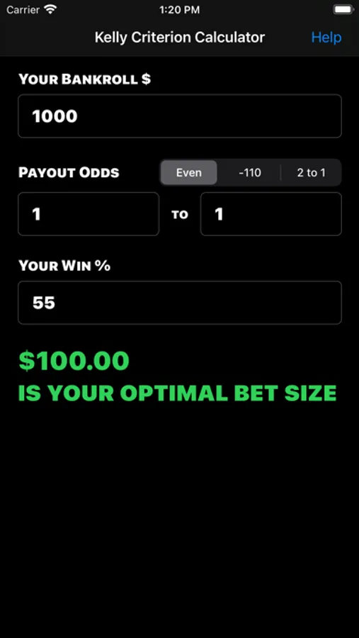 For an even money bet, the Kelly criterion computes the wager size percentage by multiplying the percent chance to win by two, then subtracting one. So, for a bet with a 70% chance to win the optimal wager size is 40% of available funds.