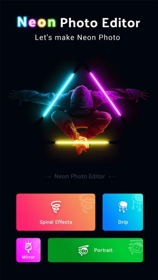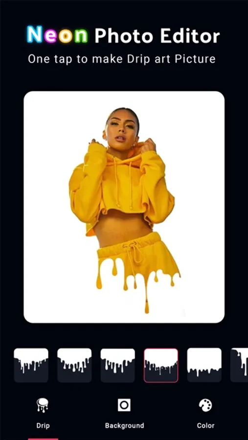 Neon Photo Editor - Auto Background Changer with Drip effect brings some motion to your photo, Unleash your inner drip artist with the awesome dripping effect and style. You can arrange the drip style and background color instantly.