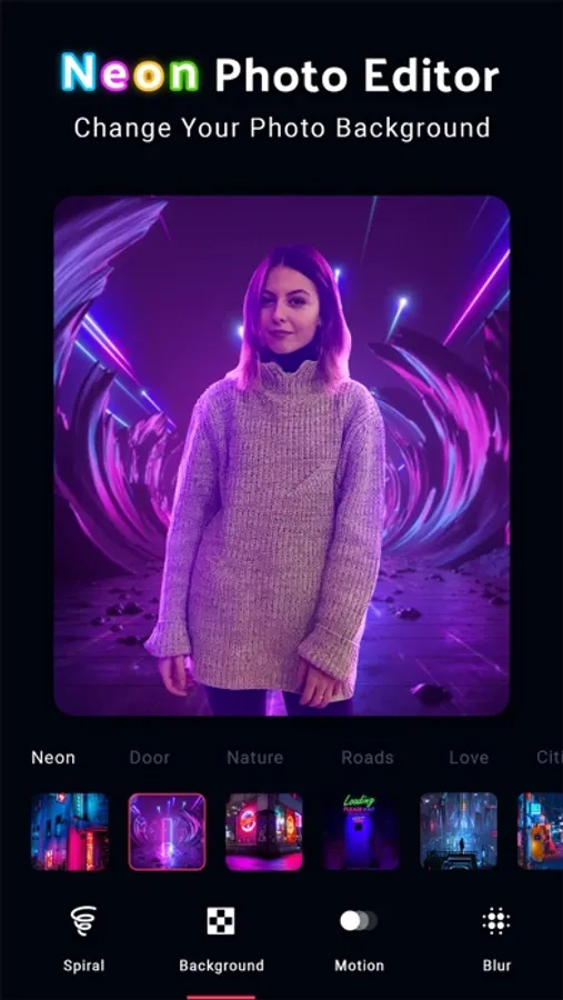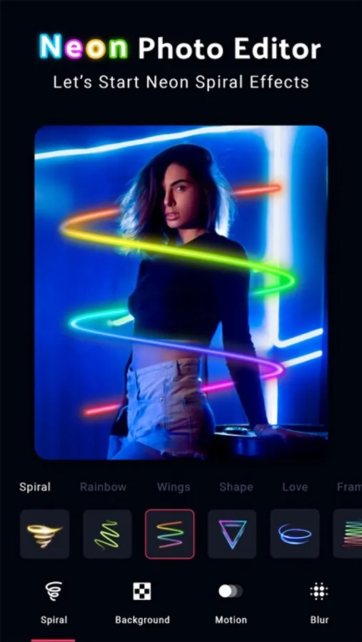 Neon Photo Editor - Auto Background Changer using it Your photo experience will be unforgettable with the neon spiral. PicSky offers a comprehensive collection of spiral effects in different styles. In addition to neon effects there are Spiral, Rainbow, Wings, Love and much more.