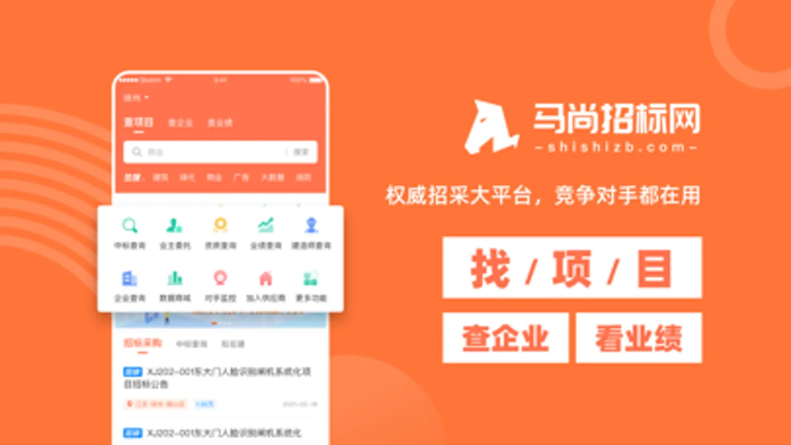 马尚招标网是一款精准实时推送招投标项目企业采购信息平台,集招标、采购、项目追踪、企业、企业监控、竞争对手检测、资质证书人员信息为一体的全网全国大数据查询系统。每日更新8万+招投标项目信息,更有1.8亿企业数据支持。平台提供信息类型有:招标公告、招标变更信息、标书代写、预审公告、招标公示、采购公告、采购预告、中标结果、中标联系方式、出让公告、出让公示、物资采购、企业信息、人员资质、建造师资质、建筑资质、企业资质、采购网、招标代理机构业绩查询等。