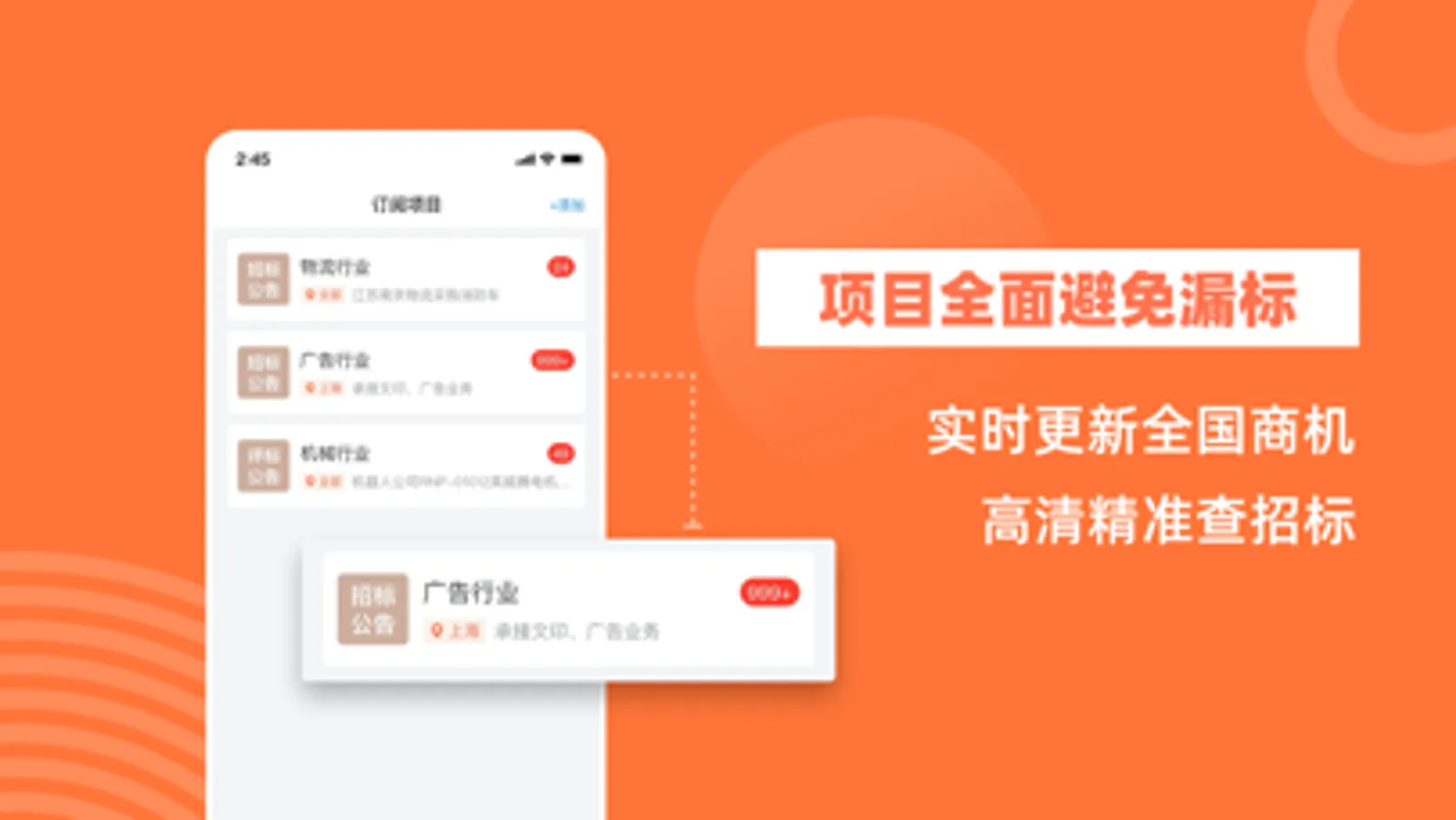 1、招标推送:全国招标信息随心订阅,随时随地即时推送,定制招标项目批量导出
