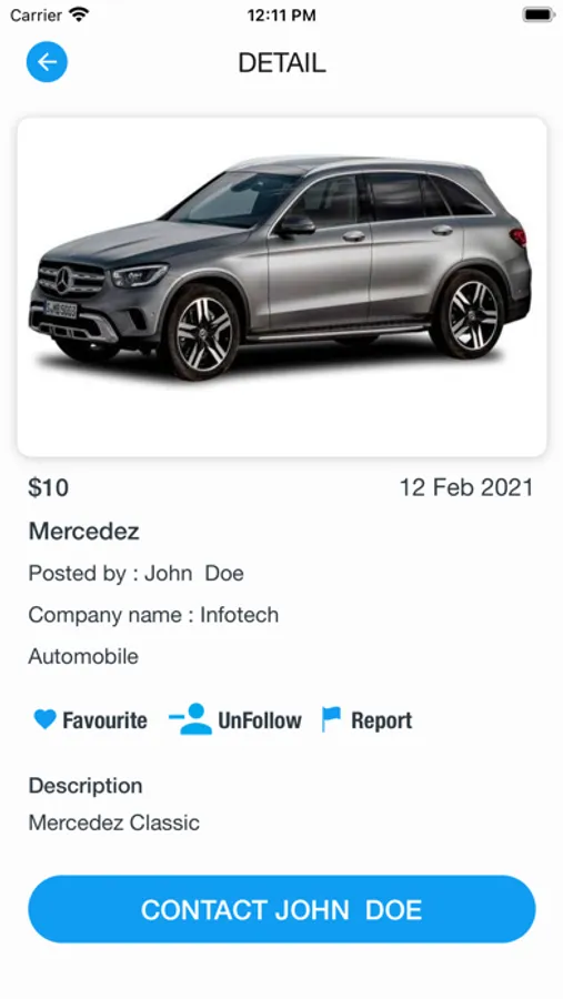 Once the User select the the particular product can see the detailed information filled with the option to Favorite/Unfavorite, Follow/Unfollow and report the post for the admin to block. User can contact the person who have posted the particular ad over the application where user can call the person to the contact number added of that particular user.