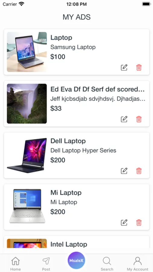 My Account: MsaleX provide user with different setting for the user to manage the application and section where user can see the ads listed by him over the application with the option to either edit or delete the ads listing from the application.