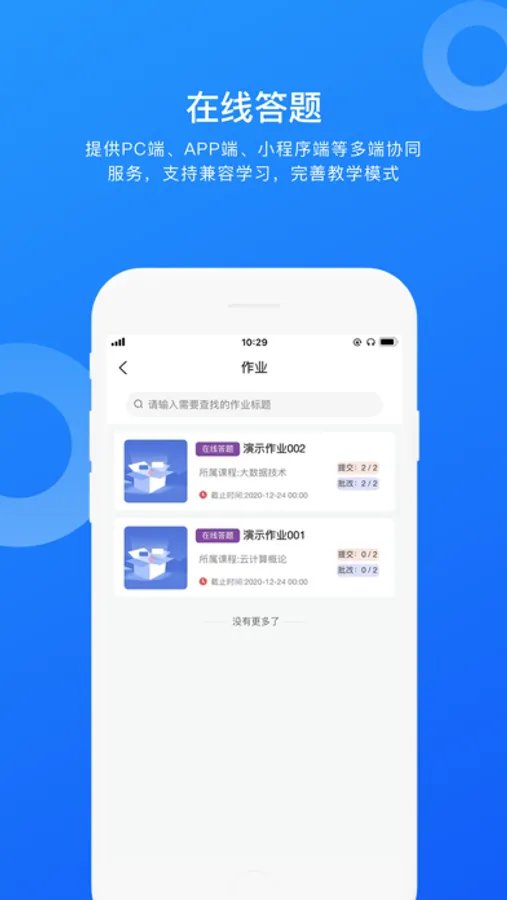 【作业】通过本平台教师用户可以快捷发布作业,监督学生作业完成情况。学生用户可以及时提交作业,查看作业反馈。为高校用户提供一个作业在线管理的平台。
