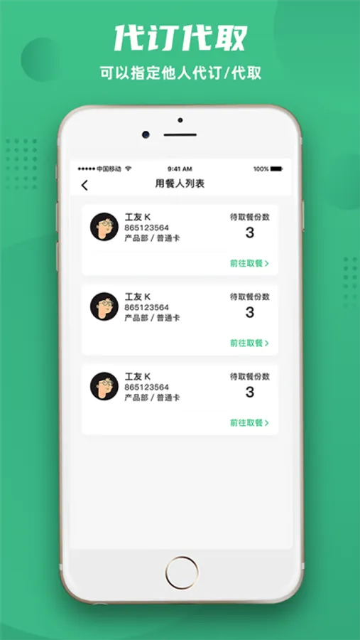 便于在外办公或者因为特殊情况无法在规定的时间内订餐/取餐,可以指定他人代订/代取