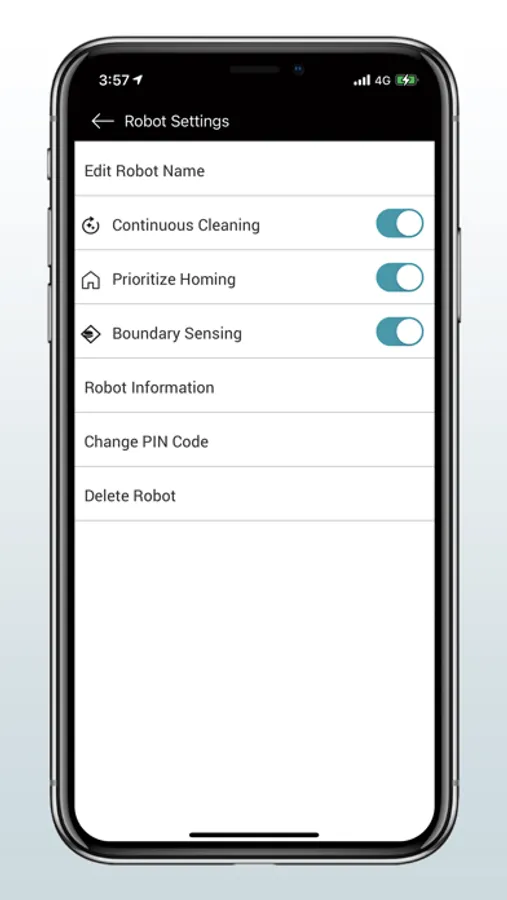 ・ROBOT SETTINGS…Continuous Cleaning, Prioritizing Homing Function, Boundary Sensing, etc.