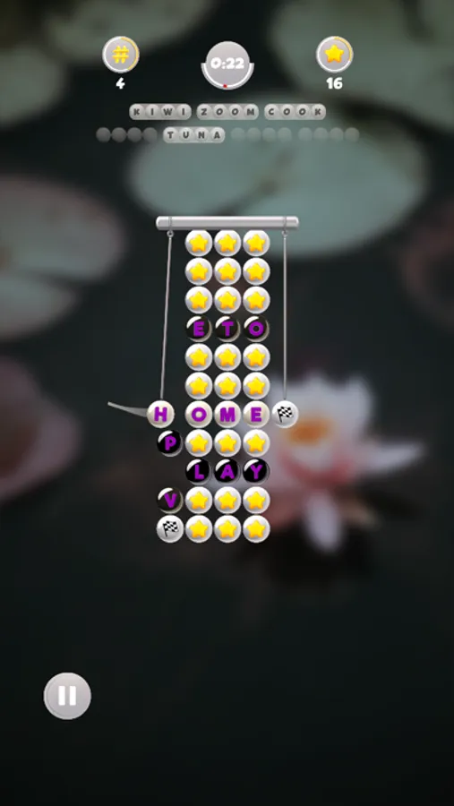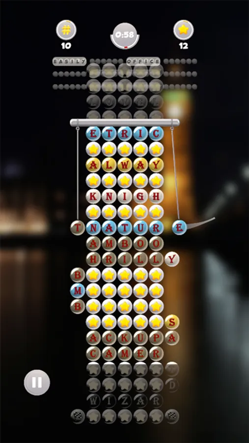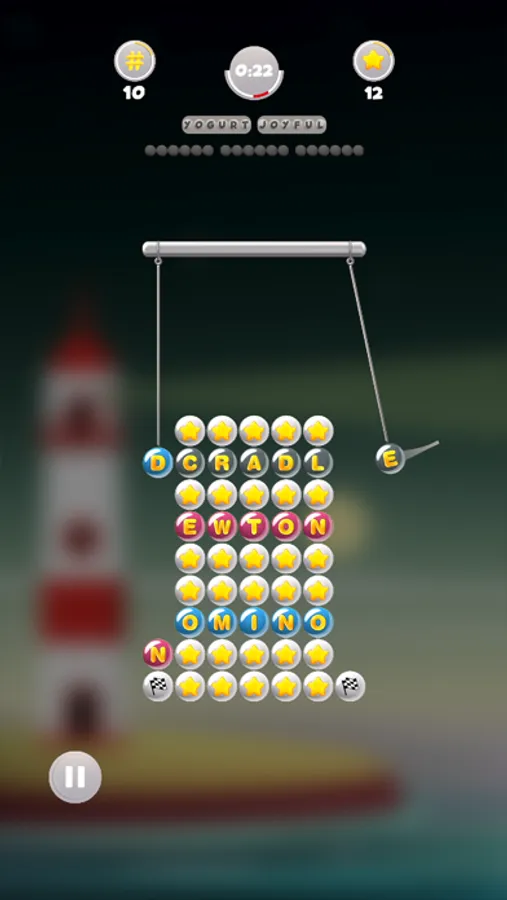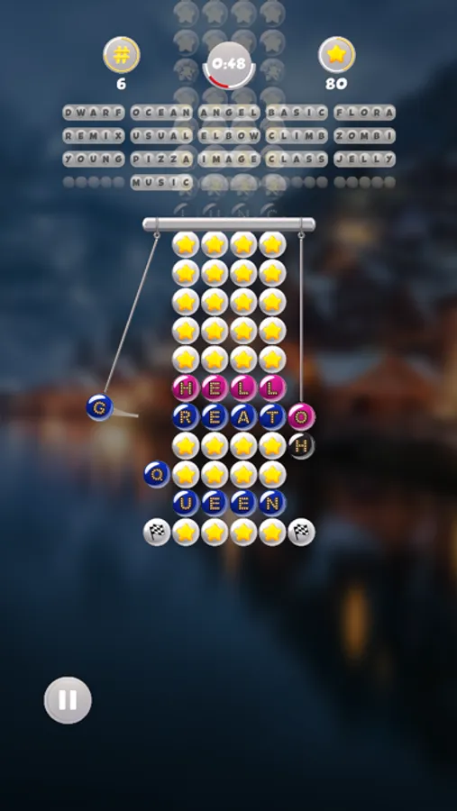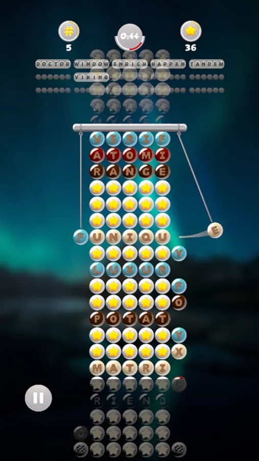 Complete words by combining swinging letters with the stationary ones. Simply swipe to play. Complete all words before pendulum stops. Try not to hit star spheres.