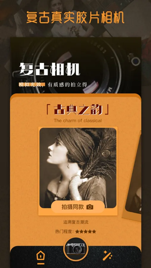 可选择古典,旅行,漫画印象,街头韵味,中华照相馆,光效斑点等多款效果,一键拍照立刻生成同款照片,让你的照片惊艳你的朋友圈~