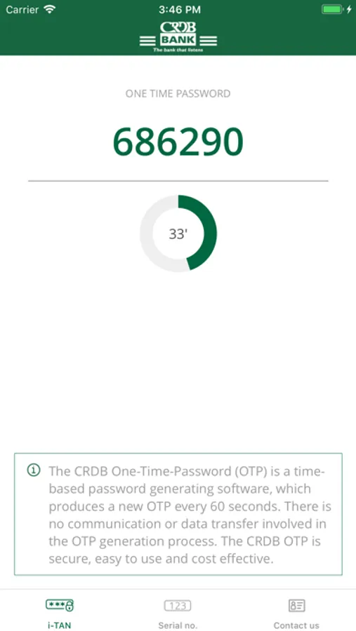 CRDB Burundi Omni Channels Mobile OTP is a time-based password generating software, which produces a new OTP every 60 seconds. There is no communication or data transfer involved in the OTP generation process. The CRDB OTP is secure , easy to use and cost effective