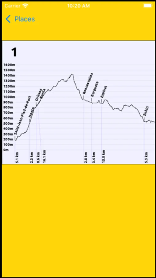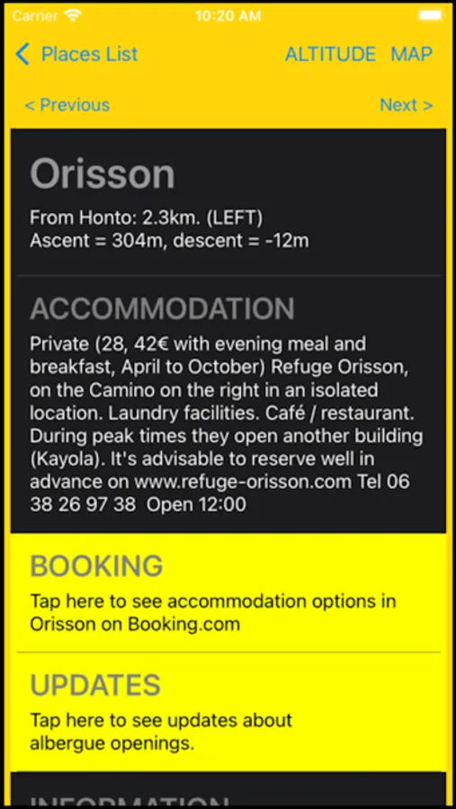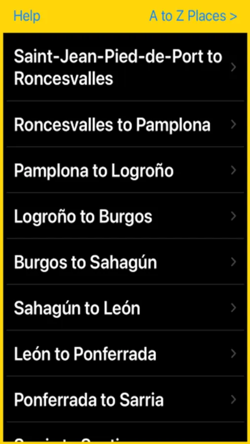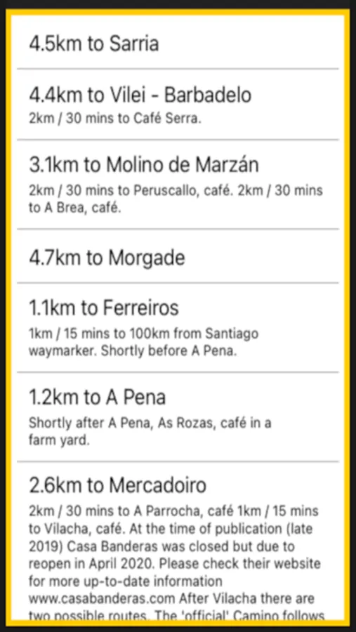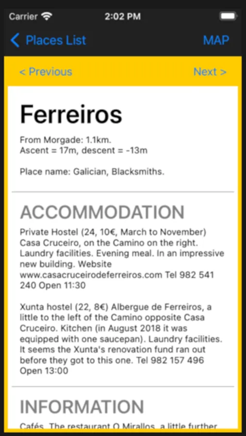 The third level gives detailed descriptions of individual places with pilgrim hostels, services, places to eat, sights and history with a link to Apple Maps with the important pilgrim facilities highlighted.