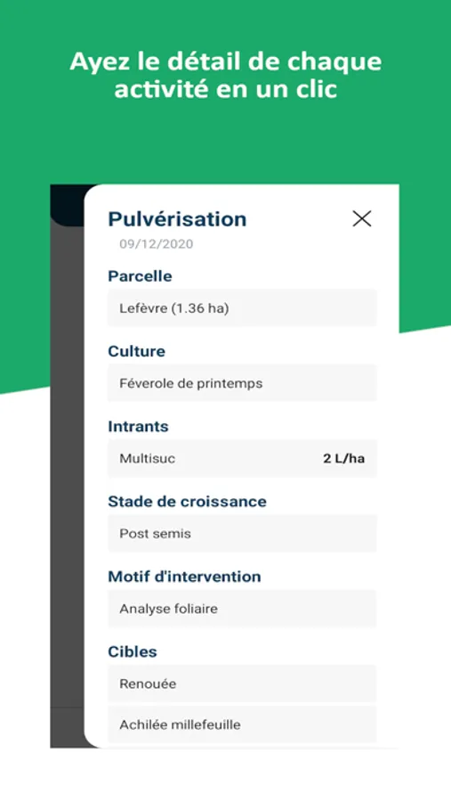 Grâce à l'application mobile Scopix, vous retrouverez toutes les interventions enregistrées automatiquement par le tracker et vos saisies d’intrants. Vous vous déplacez ainsi avec votre carnet de plaine, toujours accessible et ce même sans connexion.