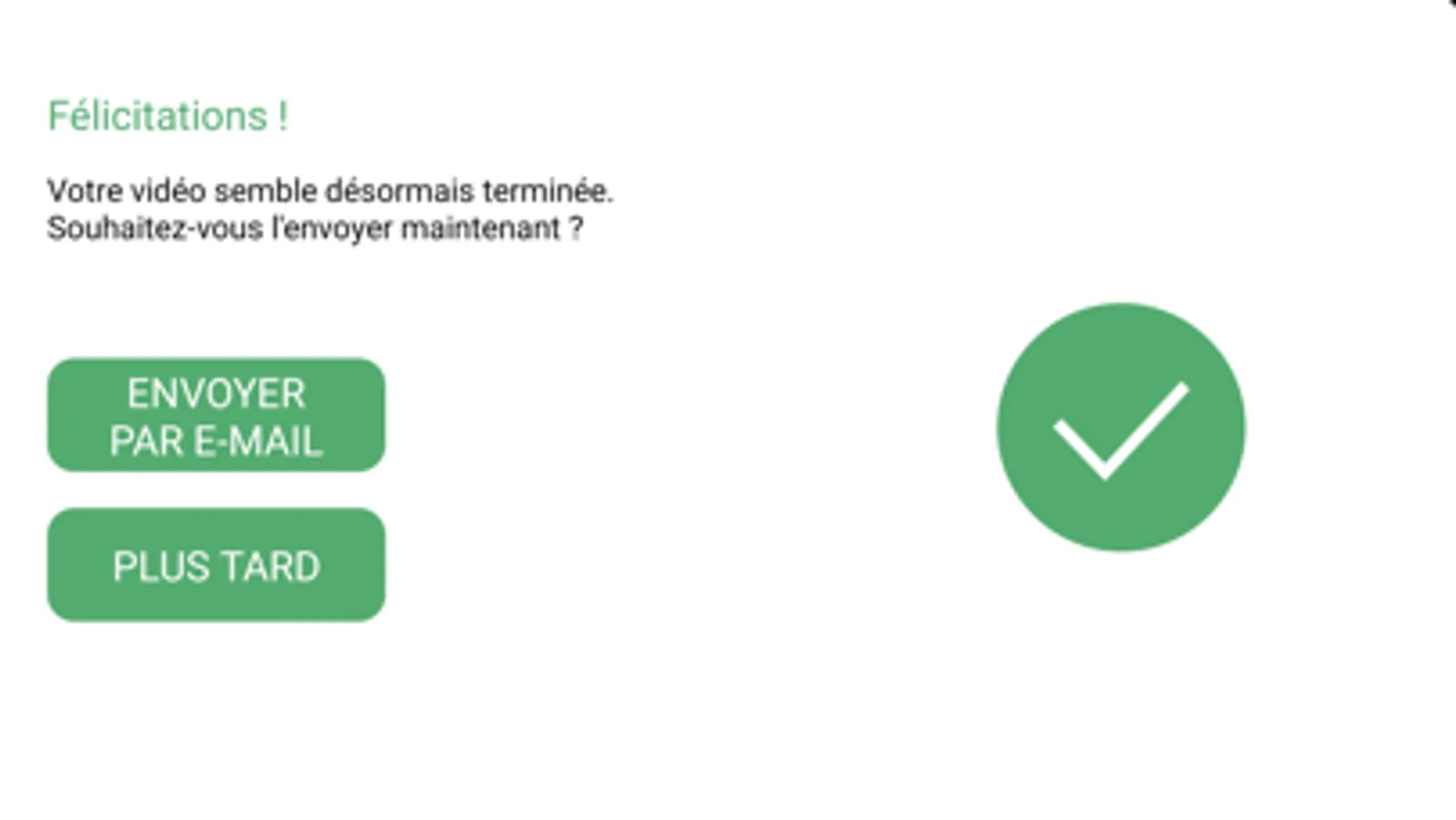 Suivez simplement les étapes de l’application, les vidéos vous sont scénarisées, montées, compilées instantanément et vous sont envoyées par mail au format mp4.