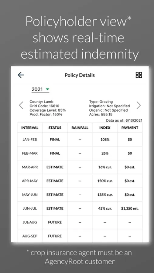 The RainfallPro Producer app provides real-time information related to the Rainfall Index plan of insurance. Grid-based rainfall information is available for free, and policy details are available for agents and policyholders of agents that are subscribed to the product.