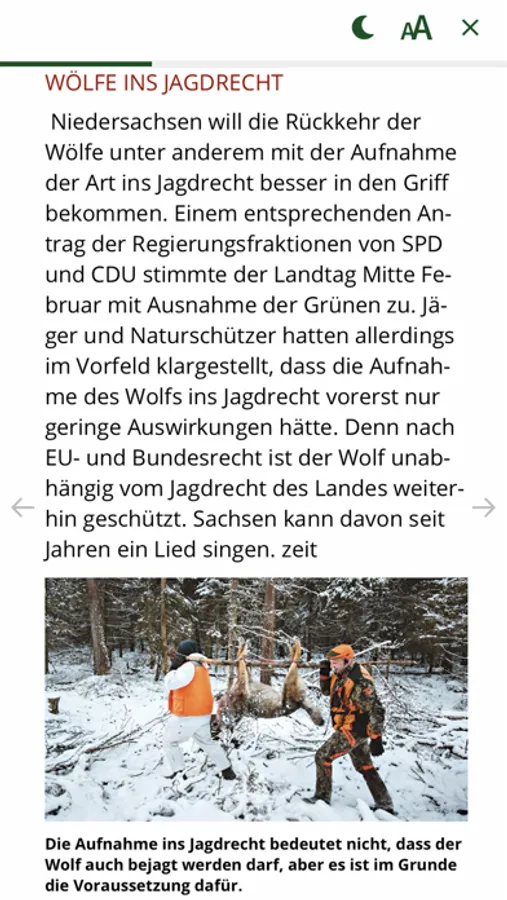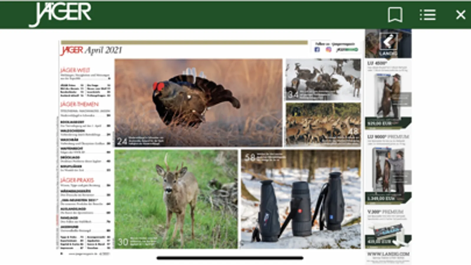JÄGER zählt zu den bekanntesten Jagdzeitschriften in Deutschland. Nicht die gesamte Jägerschaft, sondern vor allem die Revierinhaber und Jagdpächter werden angesprochen. Diese Gruppe sind die aktiven, gestandenen Jäger, die schon seit vielen Jahren in eigenen Revieren waidwerken. Alle Beiträge werden von erfahrenen Jägern in der Redaktion oder von kompetenten freien Autoren geschrieben. Inhaltsschwerpunkte sind aktuelle jagdpolitische Themen, Nachrichten und Meldungen zur Jagd, Revierpraxis, Auslandsjagd. Hinzu kommen Hundewesen und Wildbiologie, Waffen, Munition und Jagdoptik, aber auch Unterhaltung und Leserservice.