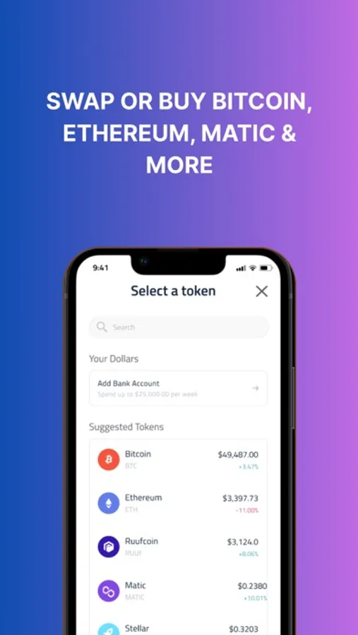 Easily link your bank account for seamless fiat to crypto transactions. Link a debit card or bank card to instantly purchase thousands of Ethereum & Polygon tokens or Bitcoin.