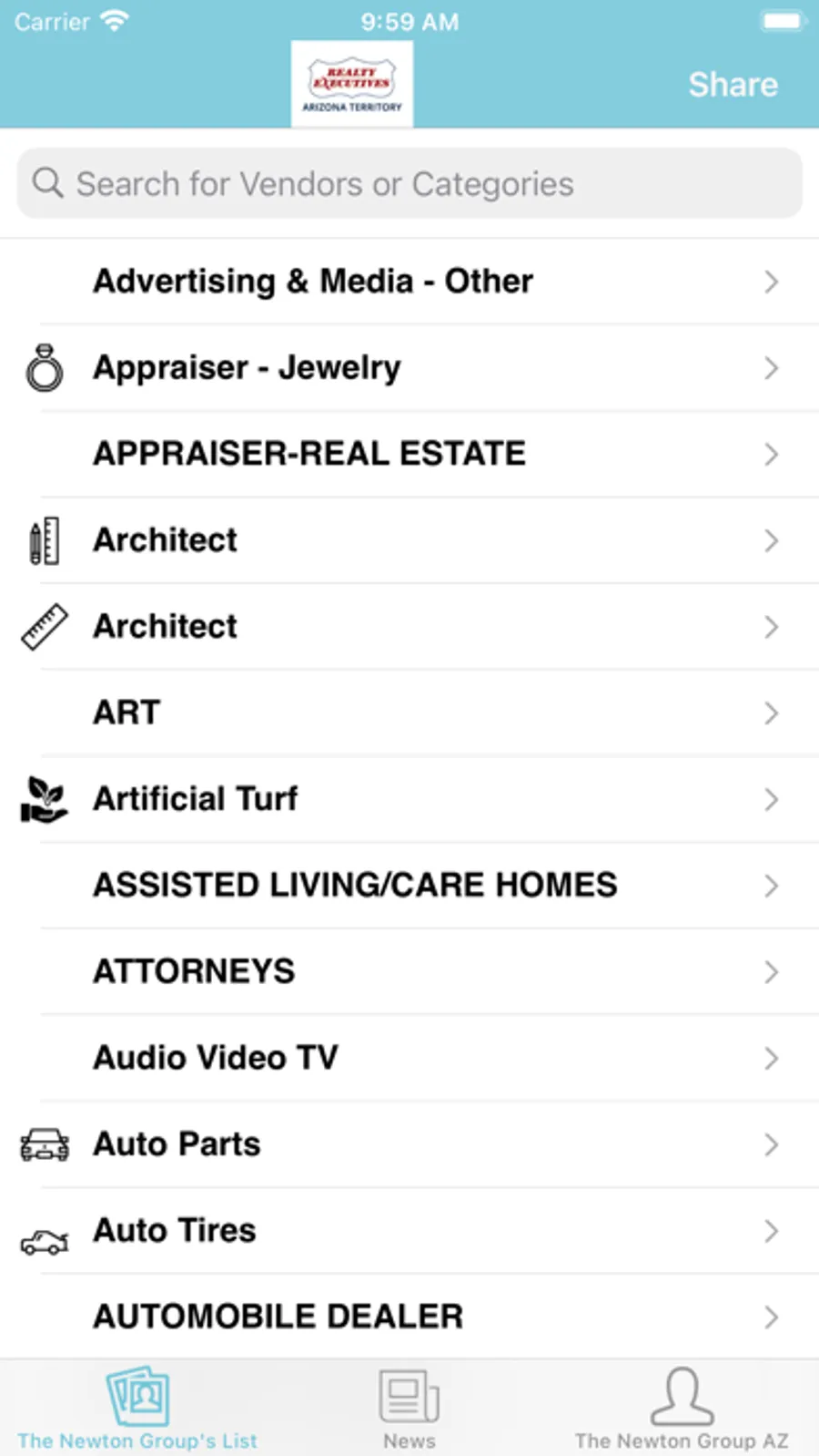 The Denise Newtons Referral List app empowers her real estate business with a simple-to-use mobile solution allowing clients to access her preferred network of vendors and stay up to date with the latest real estate updates.