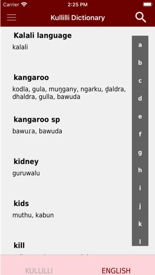 Kullilli is a language of the Thargomindah area of Queensland. It's a reawakening language. Kullilli Ngulkana is releasing this Kullilli dictionary to help Kullilli people reclaim their language. The dictionary is being regularly updated as we learn more about the language from sources recorded with elders in the 1960s and earlier.