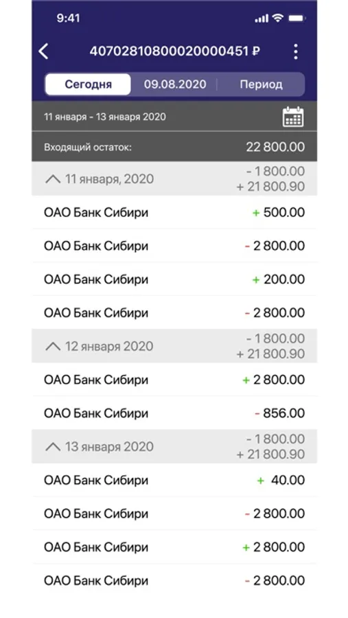 — просмотр отчета об изменении остатка средств на счете за выбранный период;