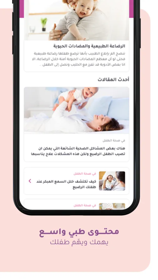مقالات موثوقة وأسئلة وإجابات من الأطباء حول كل ما يهم الأم من مواضيع متعلقة بالحمل، ورعاية الأم خلال فترة النفاس بعد الولادة الطبيعية أو القيصرية ورعاية الطفل حديث الولادة. ويشمل هذا مواضيع تتعلق بالرضاعة والفطام، والتسنين، وتغذية الطفل، والطرق الصحيحة لحمله، وتنظيم نومه، وتهدئة الطفل عند البكاء وكيفية تحميمه والاعتناء به ومراقبة تطور حواسه ومهاراته وآراء الأطباء حول أمراض الأطفال الشائعة والمشاكل التي يعاني منها الرضّع عادةً مثل المغص والتقيؤ.