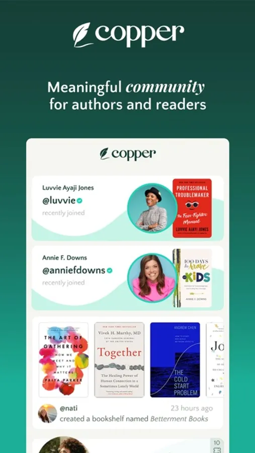 Fall in love with books all over again. Copper connects authors and readers, creating meaningful and magical experiences around books. Join the conversation, gain some inspiration, and express your shelf.