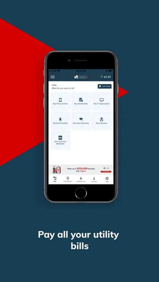 VT Pass mobile is a bills payment app through which you can make convenient payment for your day to day services like Phone Airtime Recharge and Internet Data bundle subscription (MTN, Airtel, Etisalat, Glo); Cable TV subscription such as DTSV, GOTV, Startimes; Electricity bills (PHCN) - Ikeja Electric (IKEDC), Abuja Electric (AEDC), Port-Harcourt Electric(PHED), Eko Electric (EKEDC), Jos Electric (JEDplc), Kano Electric (KEDCO), Educational payments (WAEC); Funds transfer and many other services.