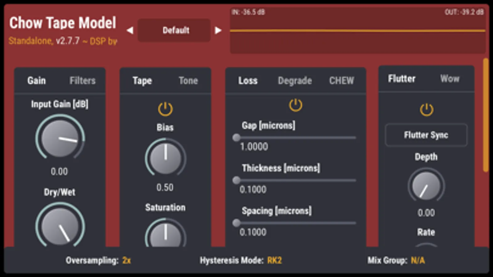 CHOW Tape Model is a physical model of an analog tape machine, implemented as an audio plugin. The model has parameters for tape distortion, playhead loss, wow/flutter, tape degradation, and more. Originally designed to emulate the Sony TC-260 reel-to-reel tape machine, the current version can emulate a wide range of tape machines and tape types.