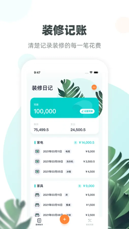 装修太痛苦,记账太烧脑?我们有它——装修记账软件,记录家庭装修的每笔支出流水,记录装修材料的价格费用,随身的装修记账本,满足装修记账需求。