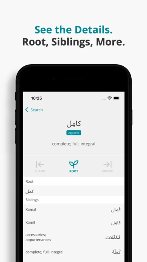 ◆ Comprehensive details including definition, part of speech, prefix, suffix, root, and siblings sharing the same root.
